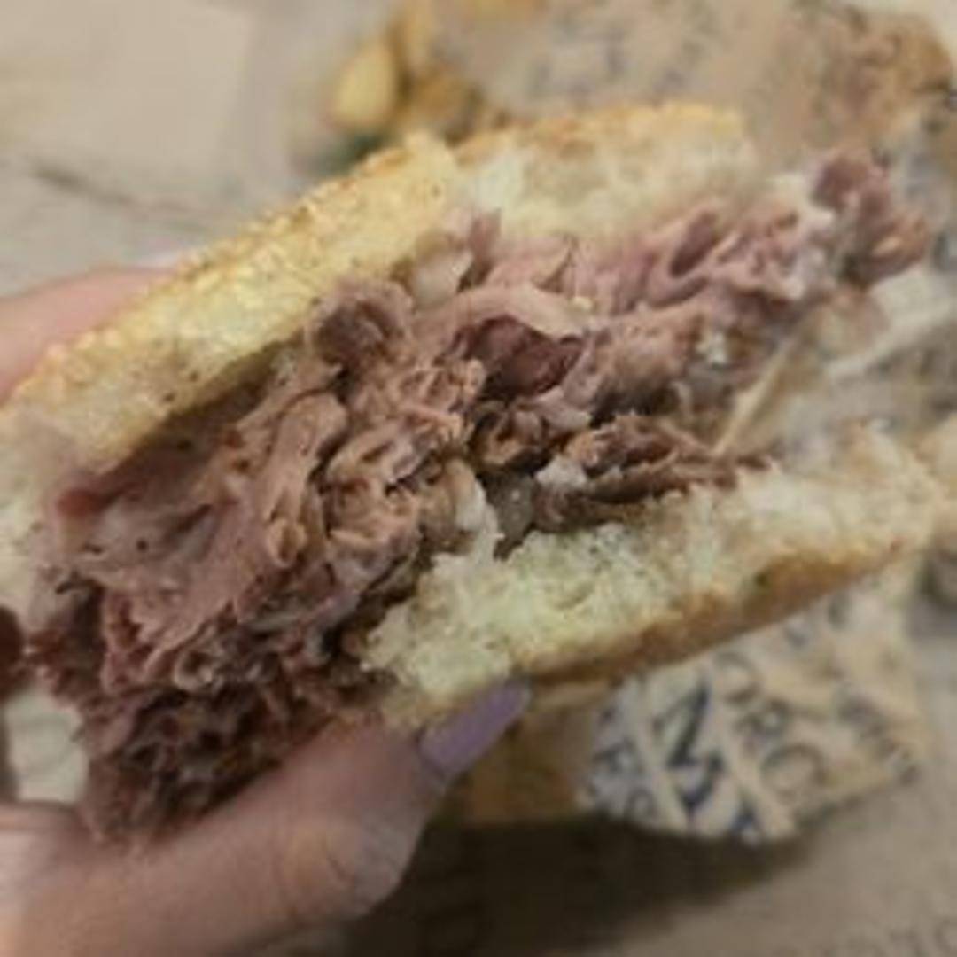 A hearty sandwich featuring thinly sliced, slow-roasted prime rib, often served on crusty bread. The prime rib is typically tender and flavorful, and the sandwich may include accompaniments such as horseradish sauce, au jus for dipping, caramelized onions, or arugula to complement the rich beef.