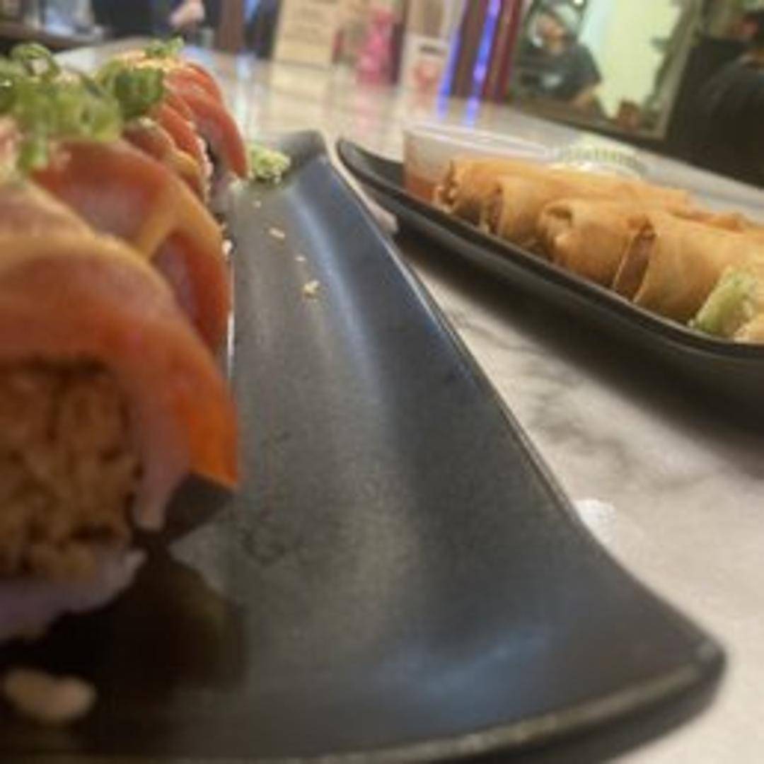 A vegetarian sushi roll consisting of tempura sweet potato, avocado, and a sweet eel sauce. Often also includes rice and nori seaweed. Commonly served with a side of soy sauce, wasabi, and ginger.