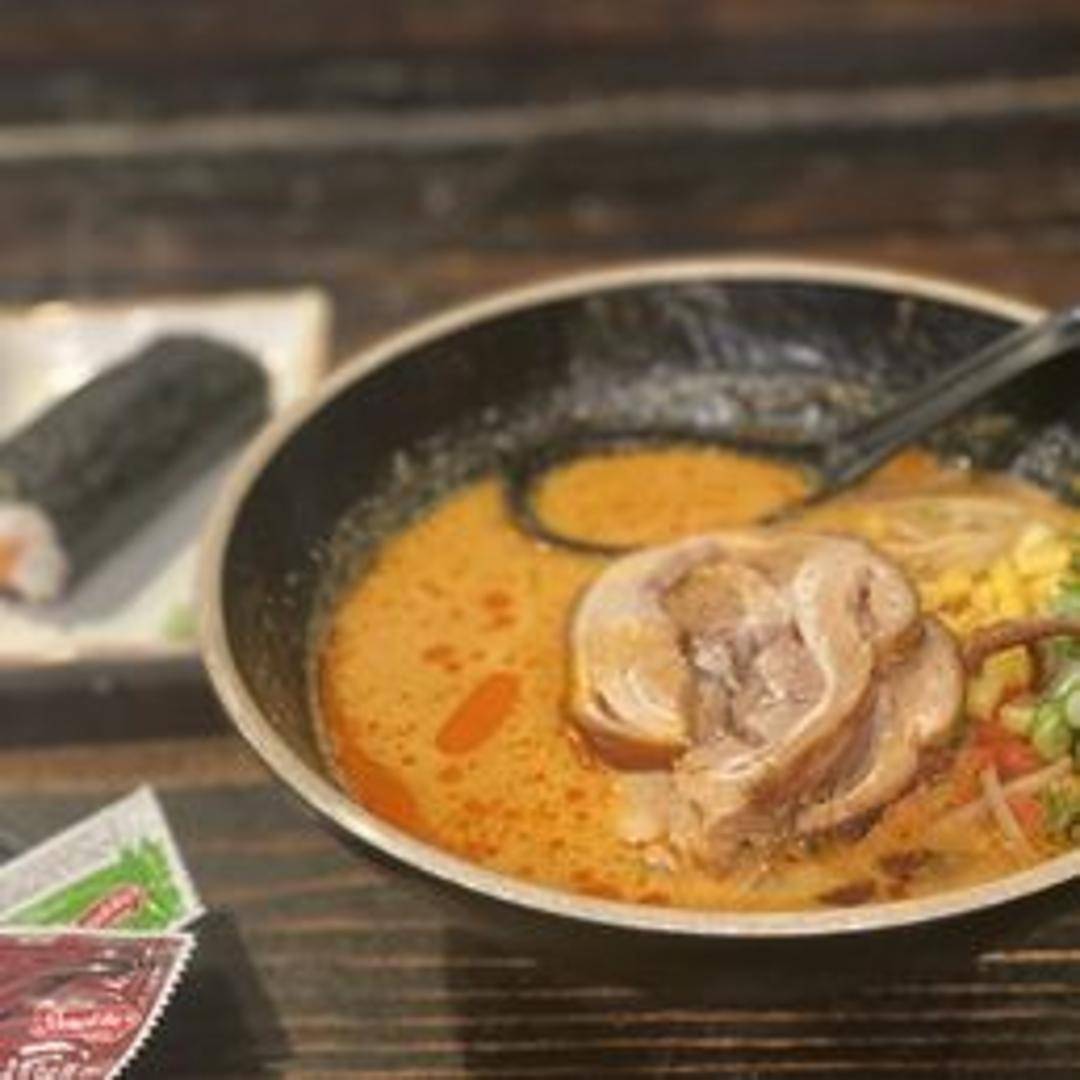 A rich and creamy ramen featuring a broth made from pork bones simmered for an extended period. The broth is typically opaque white or ivory in color and has a deep, savory flavor. It's served with ramen noodles, chashu pork (braised pork belly), a soft-boiled egg, and often includes toppings such as green onions, seaweed (nori), and mayu (garlic oil). A hearty and flavorful ramen experience.