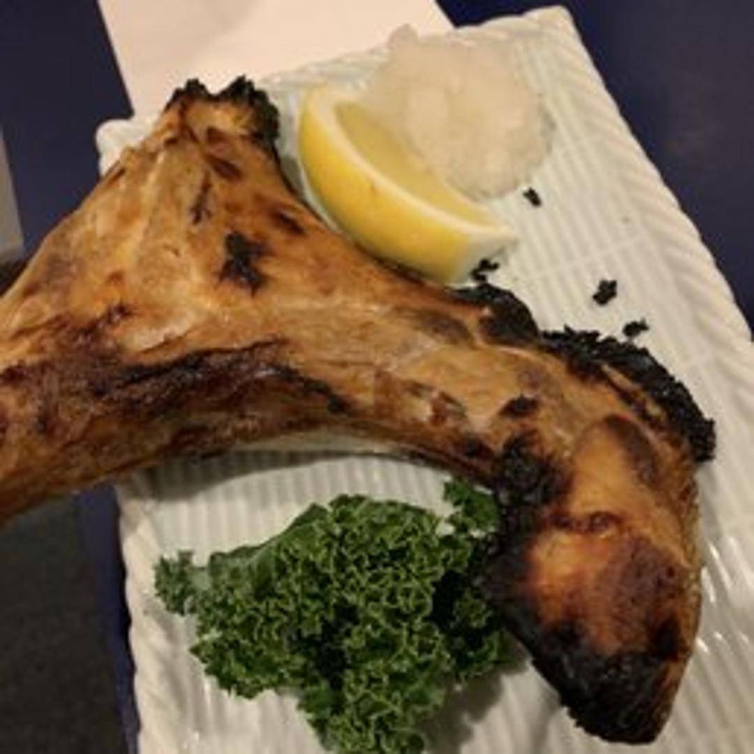 The collar of the yellowtail fish, grilled or broiled to perfection, offering a rich and flavorful cut of meat.