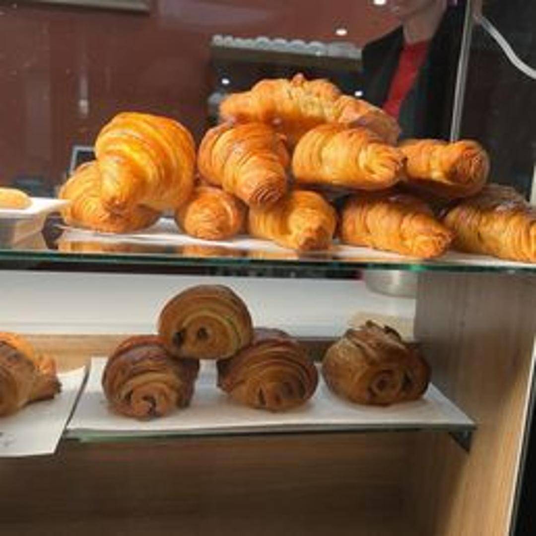 A flaky and buttery croissant filled with rich, dark chocolate. Layers of laminated dough create a light and airy texture, while the melted chocolate center offers a decadent and satisfying experience. The exterior is golden brown and crisp, providing a delightful contrast to the soft interior.