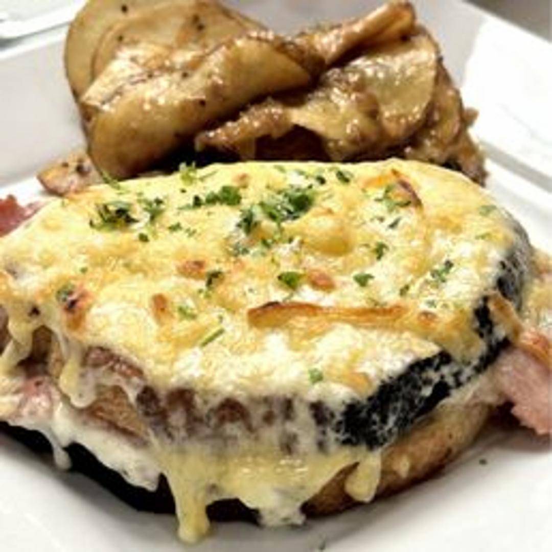 A classic French ham and cheese sandwich, topped with béchamel sauce and Gruyère cheese, then broiled until bubbly and golden brown.