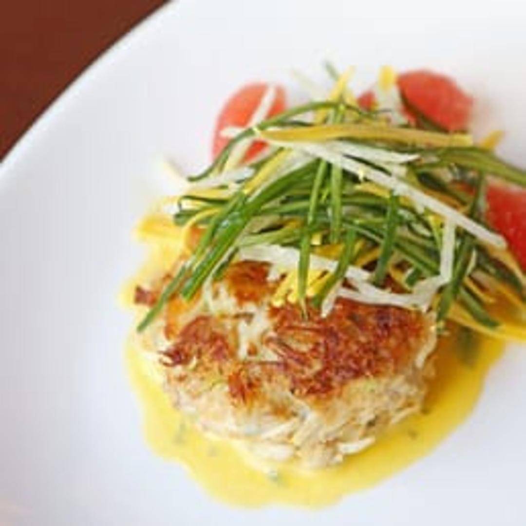 Jumbo lump crab meat formed into a cake, lightly breaded and pan-fried or baked. Served with a remoulade sauce and a small salad.