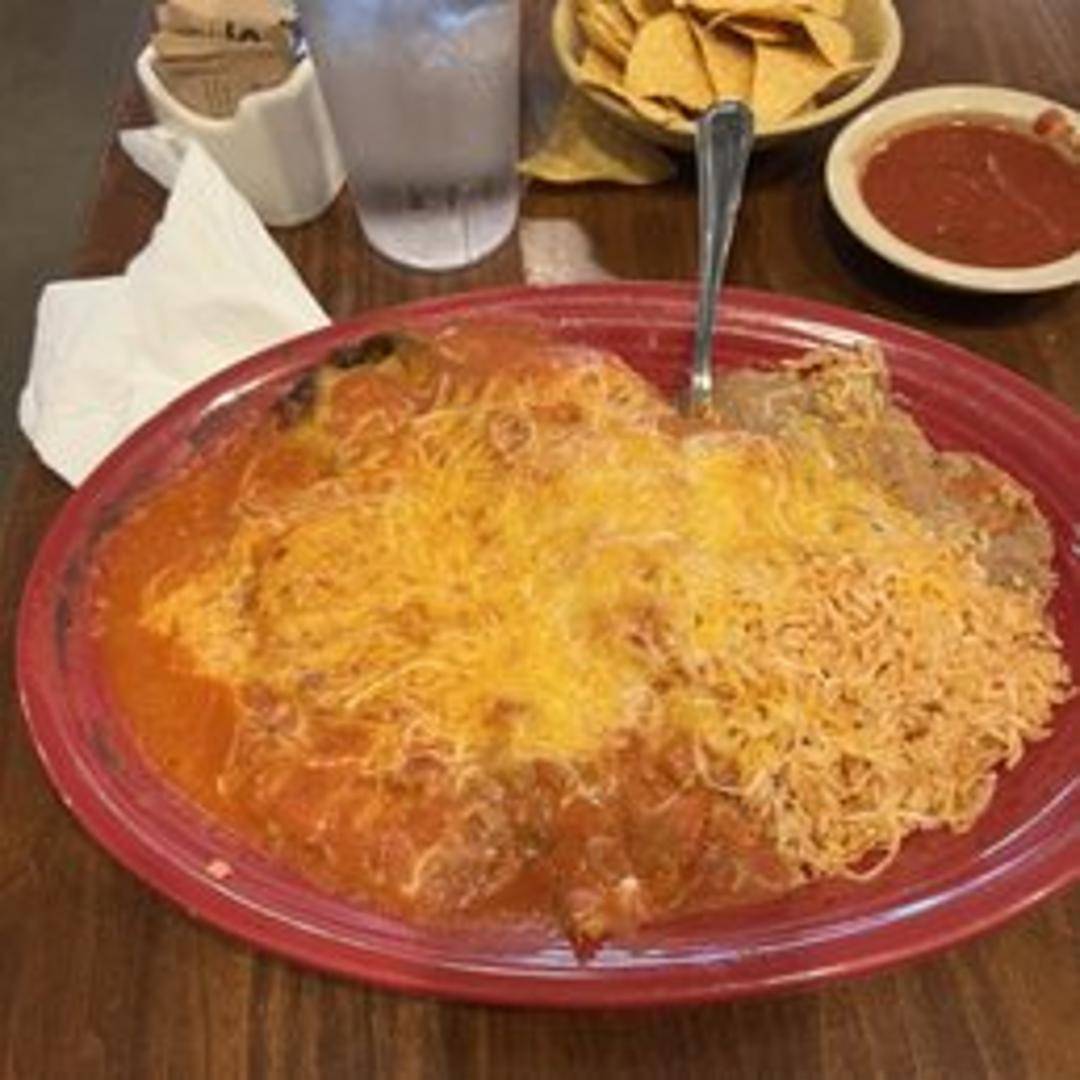 Two poblano peppers stuffed with cheese, dipped in a light egg batter, and fried until golden brown. Smothered in your choice of green chile or mild red sauce. Served with rice and beans.