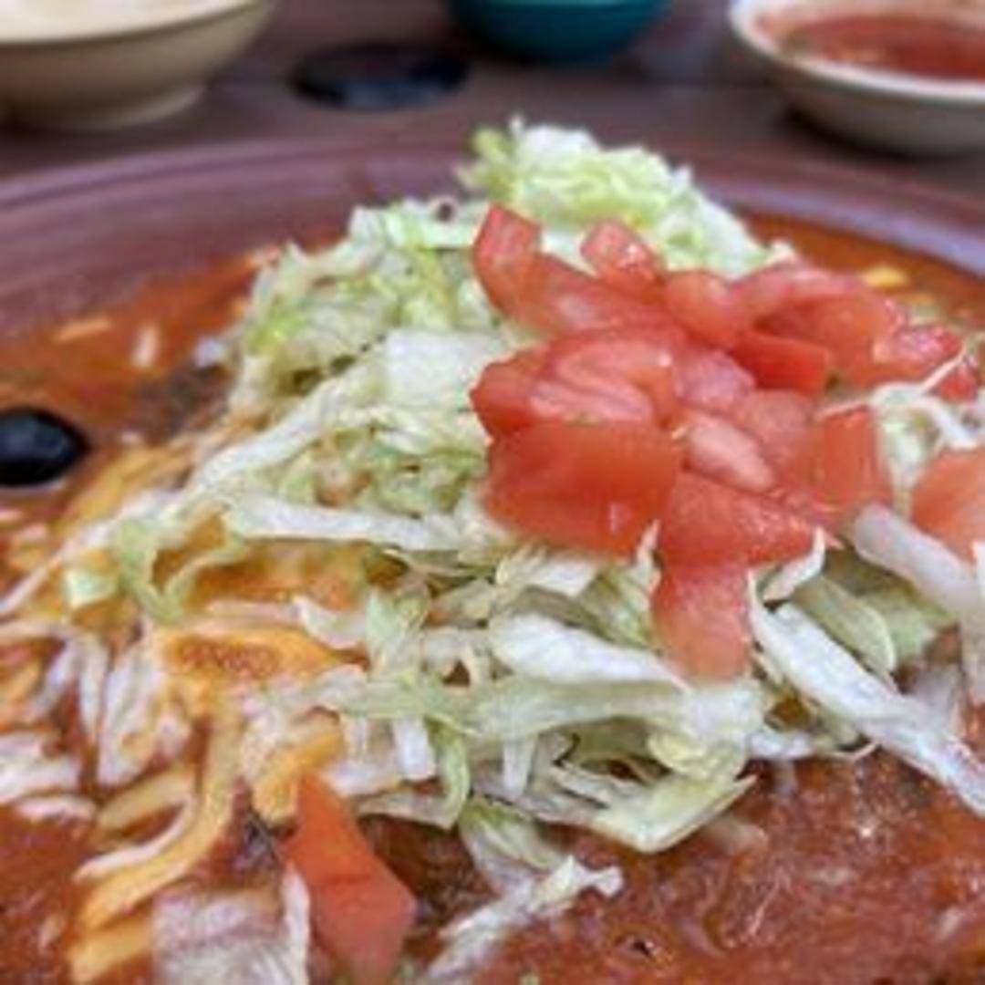 Two blue corn tortillas filled with cheese and smothered in your choice of green chile or mild red sauce. Served with rice and beans.