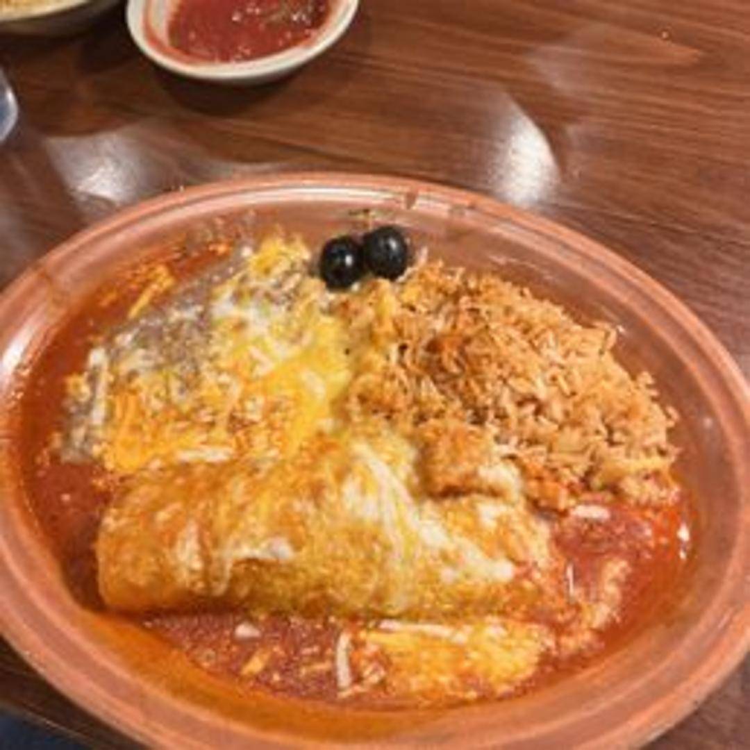 Two corn tortillas filled with shredded chicken and smothered in your choice of green chile or mild red sauce. Served with rice and beans.