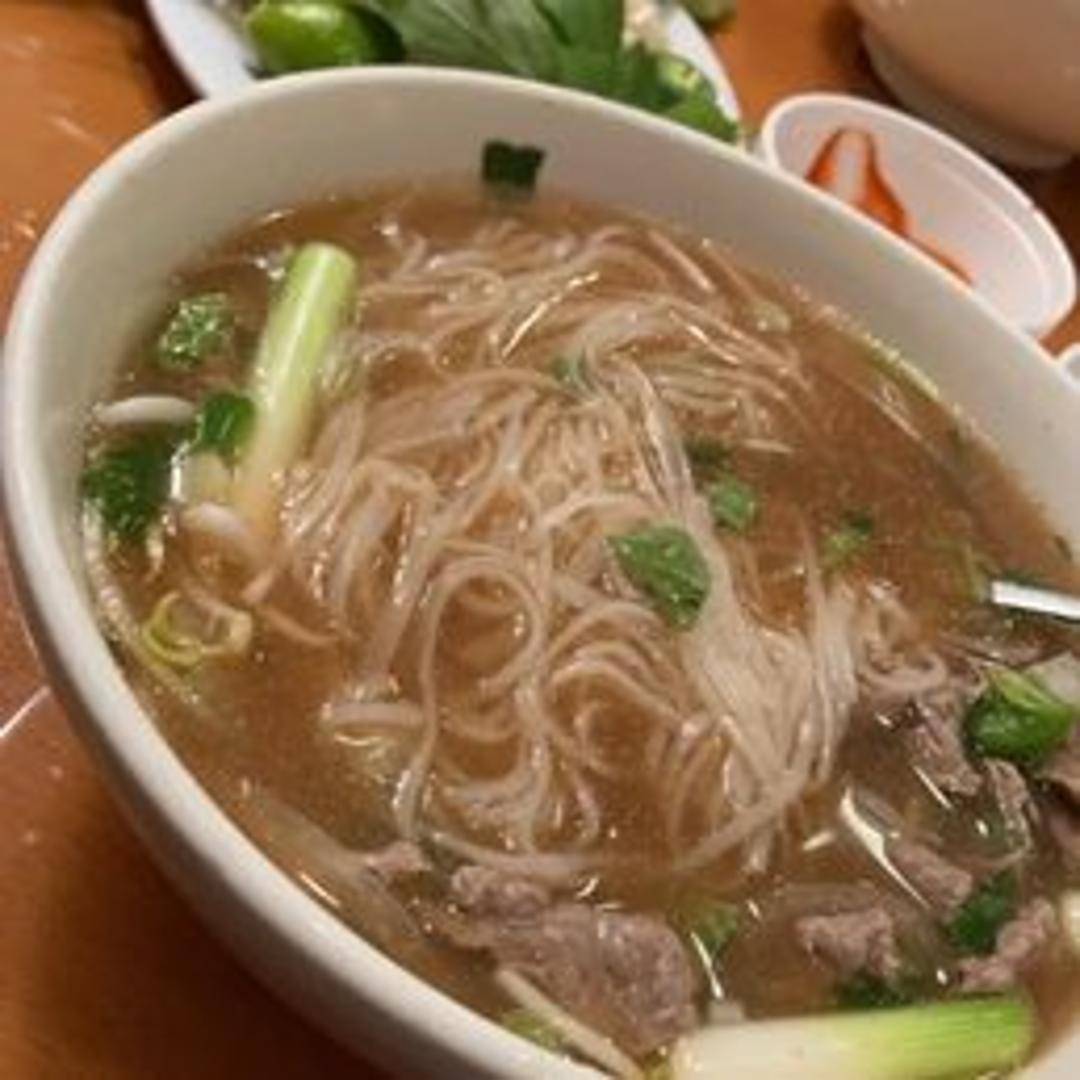A traditional Vietnamese noodle soup with a savory beef broth, rice noodles, and thinly sliced beef. Garnished with fresh herbs, including cilantro and green onions. Served with bean sprouts, lime wedges, jalapenos, and hoisin/sriracha sauce on the side.
