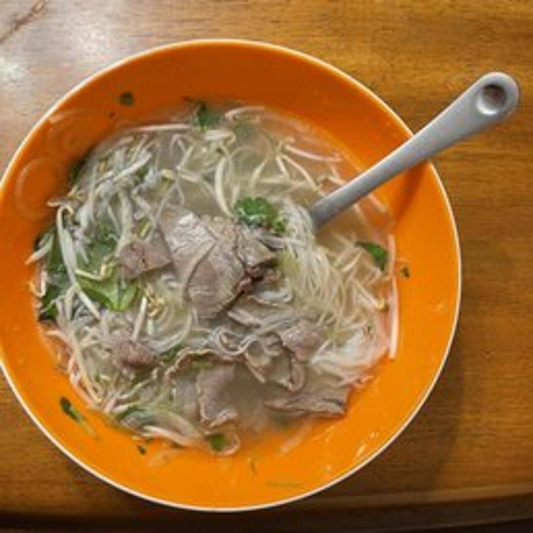 A traditional Vietnamese noodle soup featuring a rich and aromatic beef broth, thin rice noodles, and thinly sliced rare beef (tai) that cooks in the hot broth. Often garnished with fresh herbs like cilantro, basil, and bean sprouts, along with lime wedges and chili peppers for added flavor.