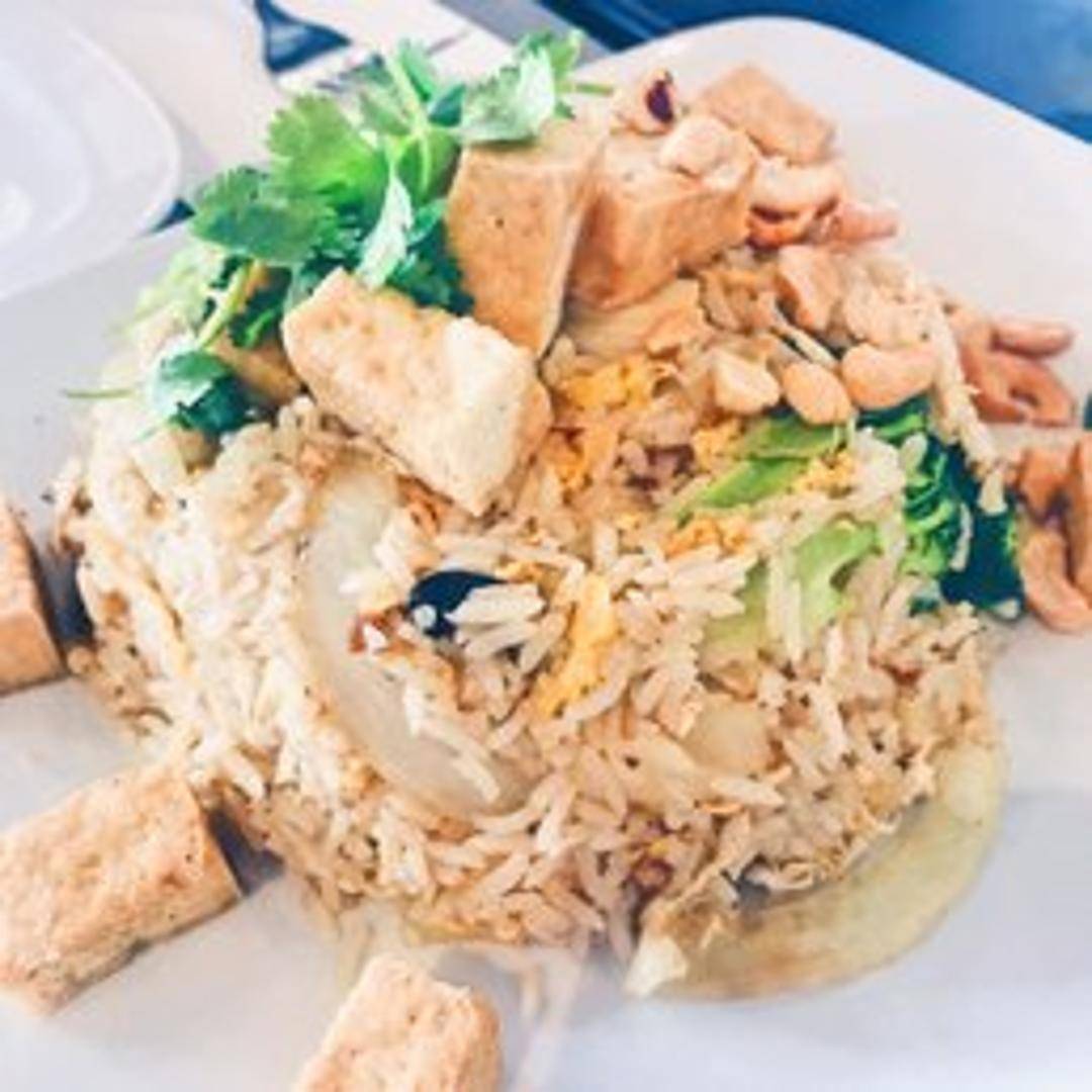 Delicious fried rice stir-fried with pineapple chunks, raisins, cashew nuts, onions, carrots, peas, and egg. Served in a pineapple shell for an authentic presentation.