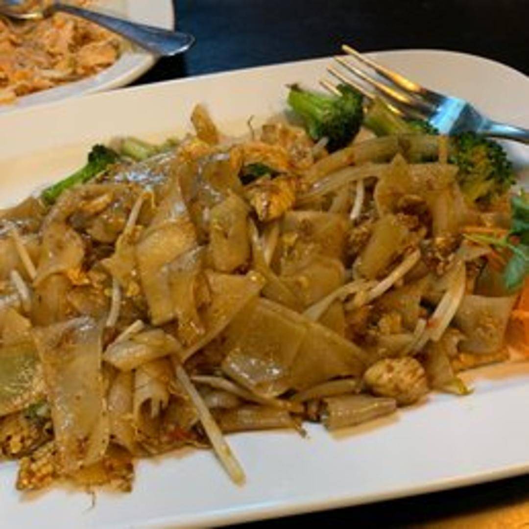 Wide rice noodles stir-fried with your choice of protein (Tofu, Chicken, Pork, Beef, or Shrimp), basil, bell peppers, onions, tomatoes, and chili in a savory and slightly spicy sauce. Contains soy sauce, fish sauce, and oyster sauce.