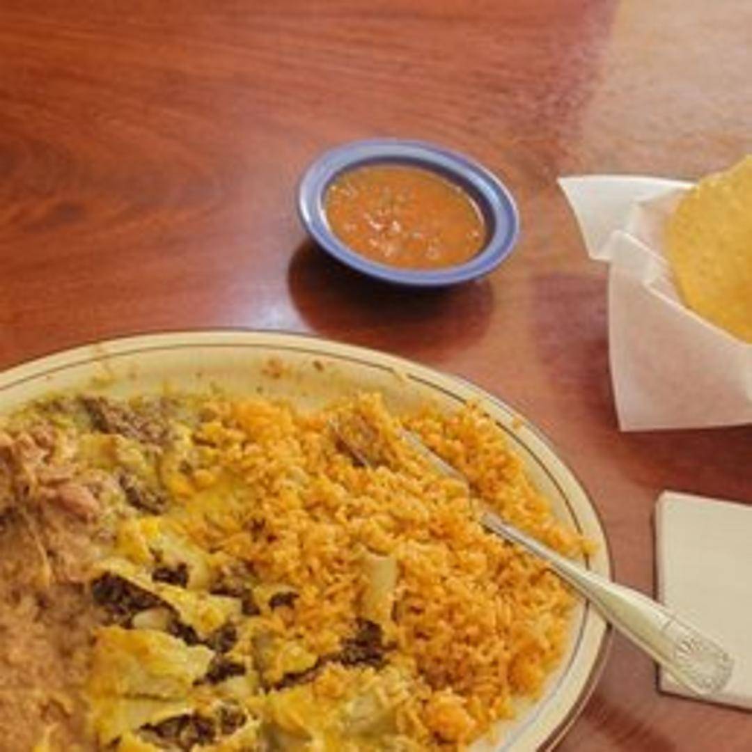 Corn tortilla filled with your choice of filling (cheese, chicken, beef), covered in sauce and melted cheese.