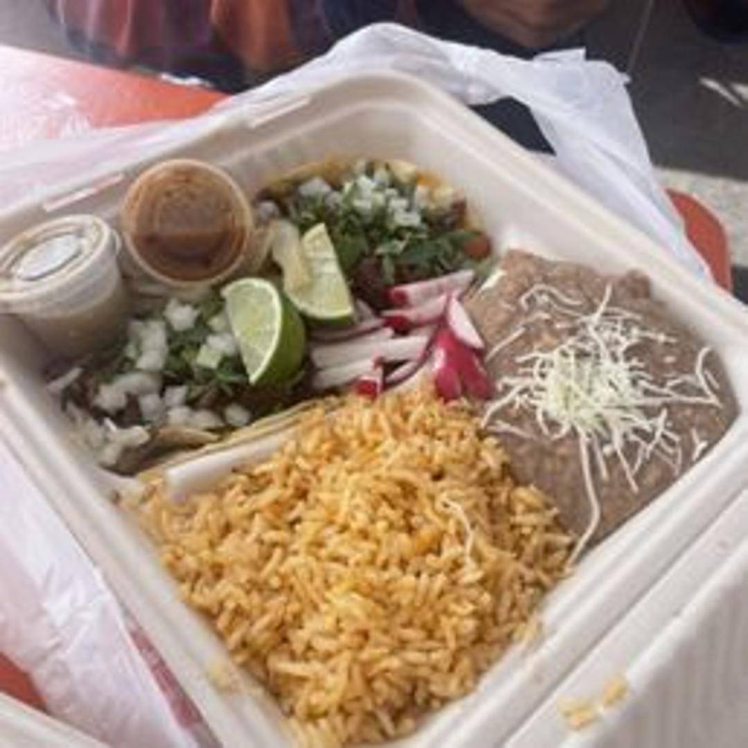 Three corn or flour tortillas filled with your choice of meat (asada, al pastor, carnitas, chicken, or veggie). Served with rice and beans, pico de gallo and your choice of salsa.