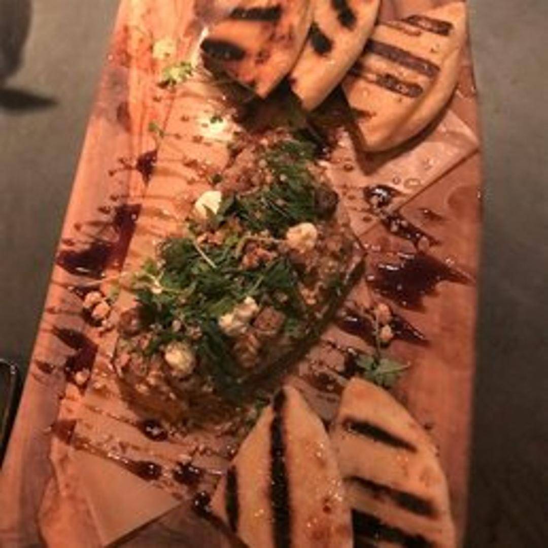 Smoky eggplant dip with tahini, lemon, and garlic, served with warm pita bread.