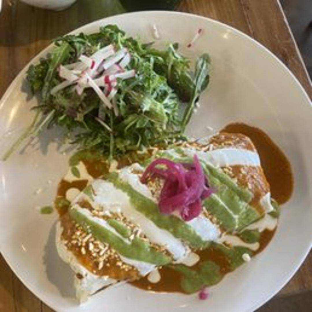 A hearty burrito filled with scrambled eggs, cheese, your choice of meat (options include bacon, sausage, chorizo), potatoes, and salsa.