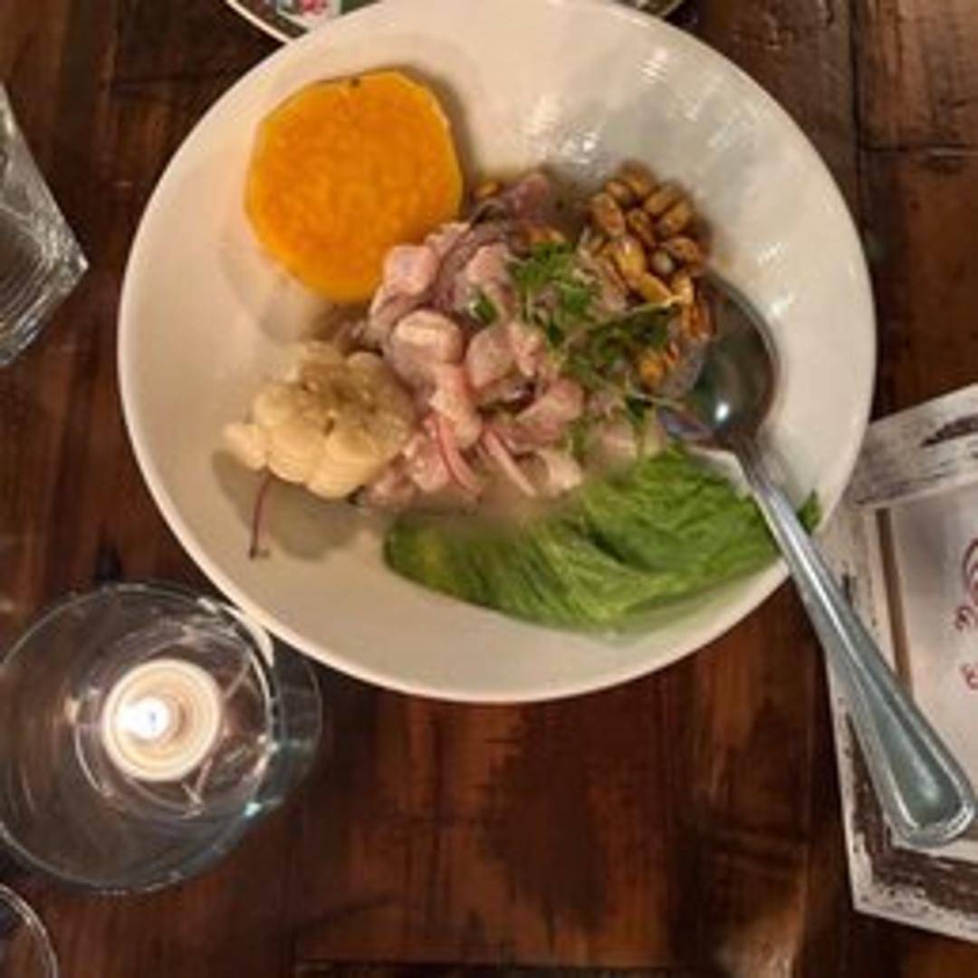 The quintessential Peruvian ceviche, showcasing fresh, tender chunks of white fish marinated in a potent and vibrant leche de tigre. This classic preparation combines freshly squeezed lime juice, sliced red onions, cilantro, and aji rocoto for a spicy kick. Traditionally served with slices of sweet potato and giant Peruvian corn (choclo).