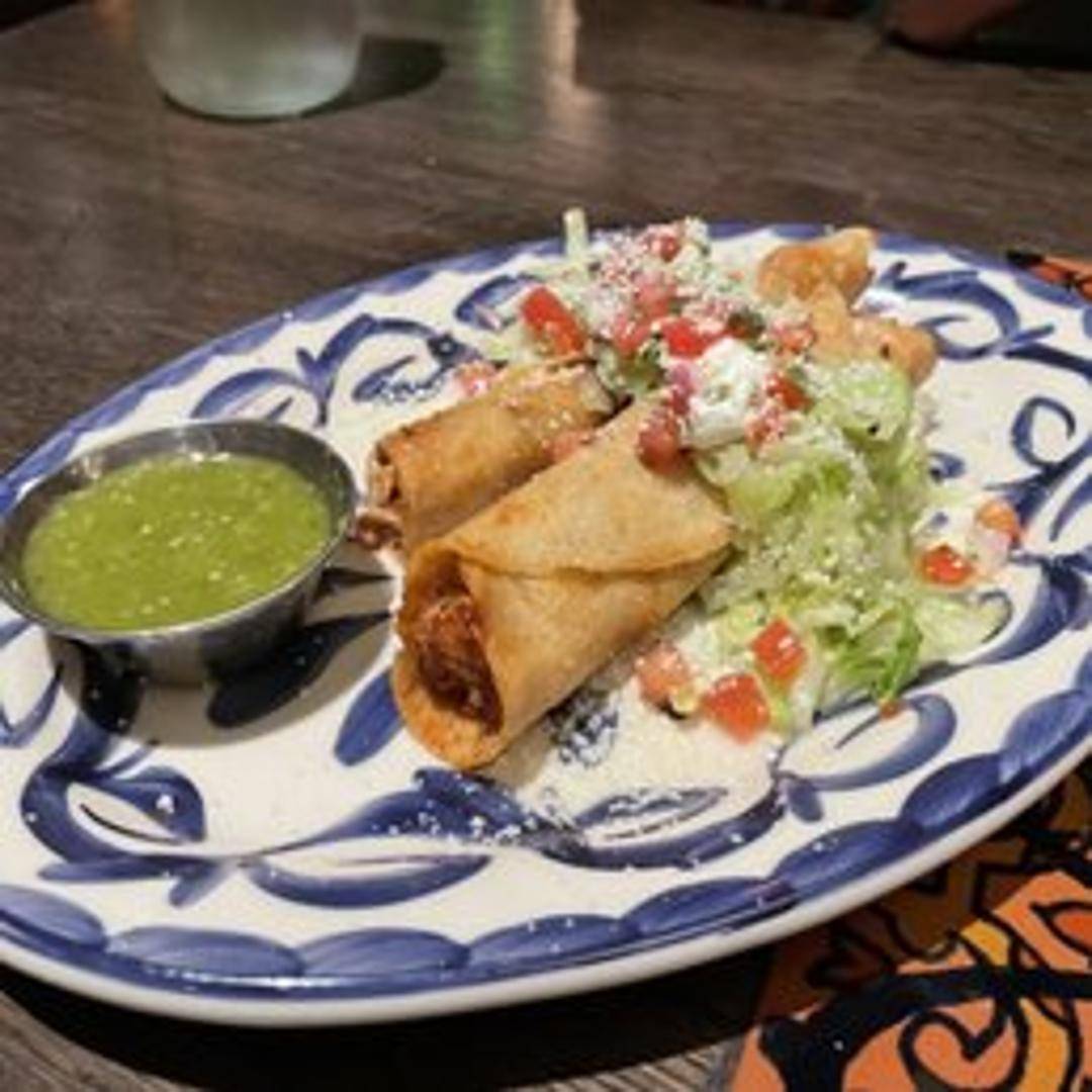 Four crispy, golden-fried rolled corn tortillas filled with your choice of seasoned shredded chicken or beef. Topped with crisp lettuce, fresh tomato, a drizzle of crema, and a dusting of cotija cheese. Served with a side of tangy salsa verde.