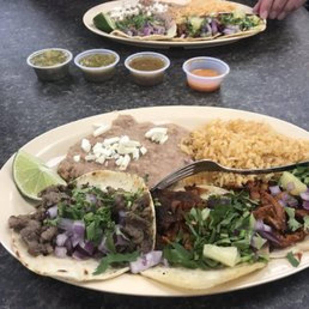 A combination plate featuring a selection of tacos, often including rice and beans. A great way to sample different taco fillings or enjoy a more substantial meal. Specific taco fillings may vary.