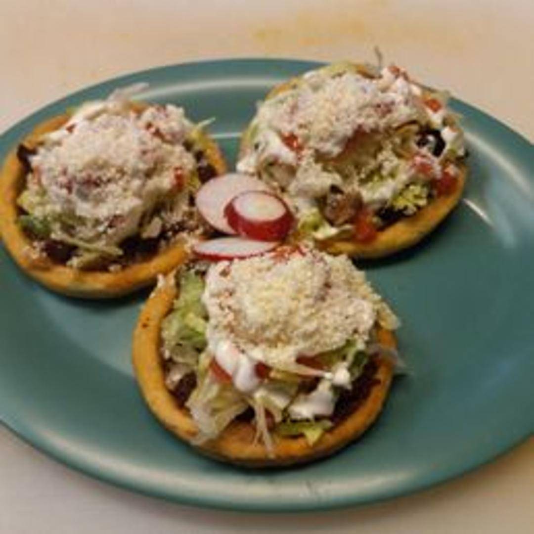 Thick, handmade corn tortillas lightly fried and topped with various ingredients. Typically includes refried beans, your choice of meat (e.g., Pollo, Asada, Carnitas), shredded lettuce, crumbled cheese, salsa, and sour cream. May also include other toppings like onions, tomatoes, or guacamole.