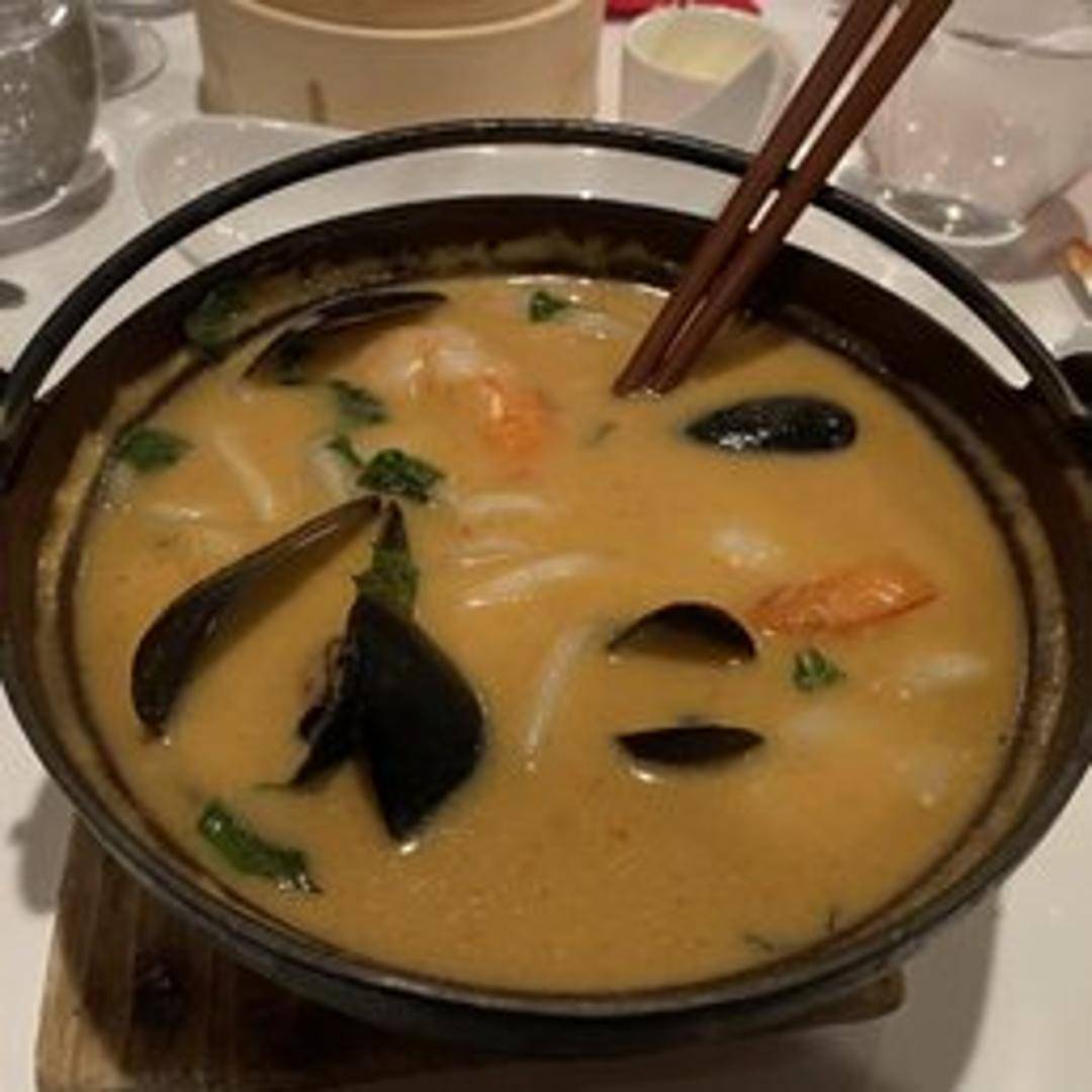 An exquisite communal hot pot brimming with the freshest catch from the sea. Enjoy a fragrant, savory broth infused with lemongrass and herbs, perfect for gently cooking succulent shrimp, tender squid, delicate fish slices, and mussels, alongside an array of fresh vegetables and noodles.