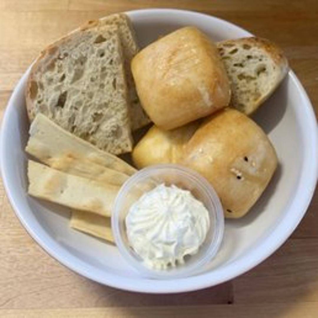 A warm and inviting assortment of freshly baked artisanal breads, perfect for sharing. This basket includes a selection of our daily baked favorites, served with whipped butter and a fragrant olive oil for dipping.
