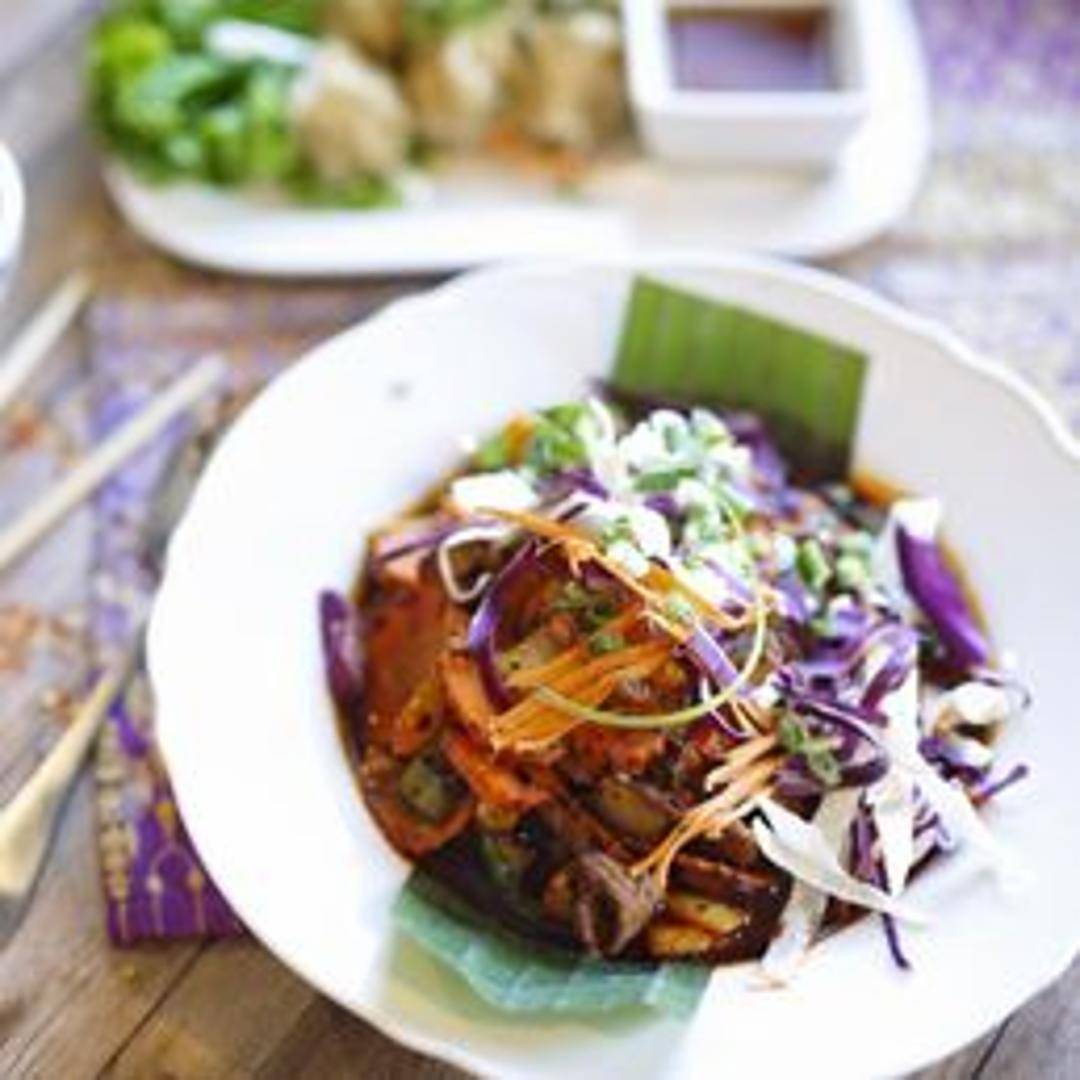 Stir-fried noodles with a savory chili paste sauce, onions, bell peppers, carrots, and your choice of protein (tofu, chicken, pork, beef, shrimp, or vegetable medley). Garnished with fresh basil.