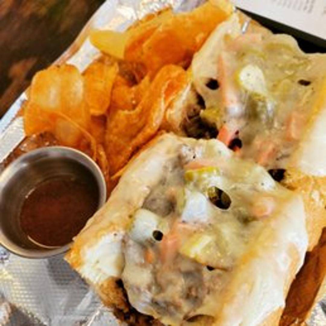 Italian beef sandwich served on a crusty roll, loaded with thinly sliced, seasoned beef, giardiniera peppers, and au jus for dipping.