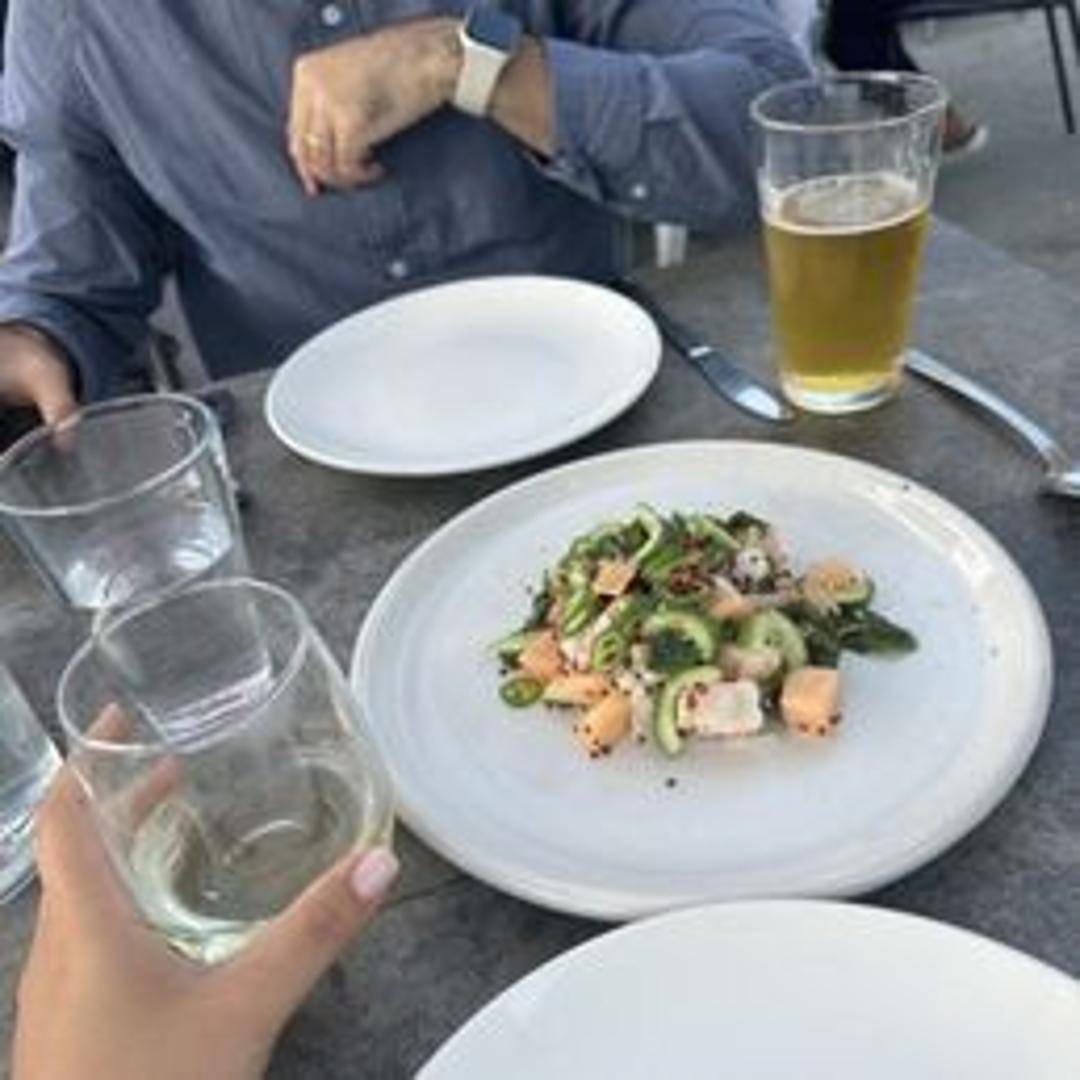 Grilled shrimp, cantaloupe, honeydew, arugula, feta cheese, and a citrus vinaigrette.
