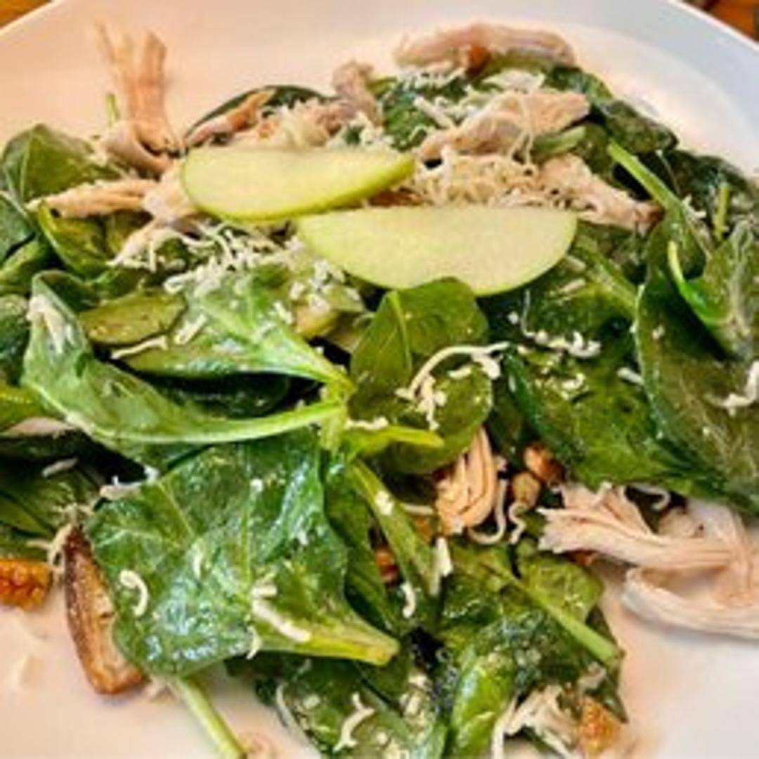 A signature salad, likely featuring a combination of fresh greens, seasonal fruits, nuts, and cheese, dressed with a complementary vinaigrette. May include grilled chicken or other protein.