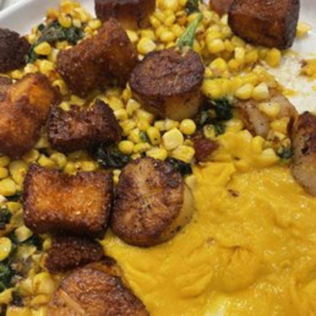 Pan-seared scallops, cooked to perfection with a delicate sear on the outside and a tender, sweet interior. Prepared with seasonal vegetables and a flavorful sauce.