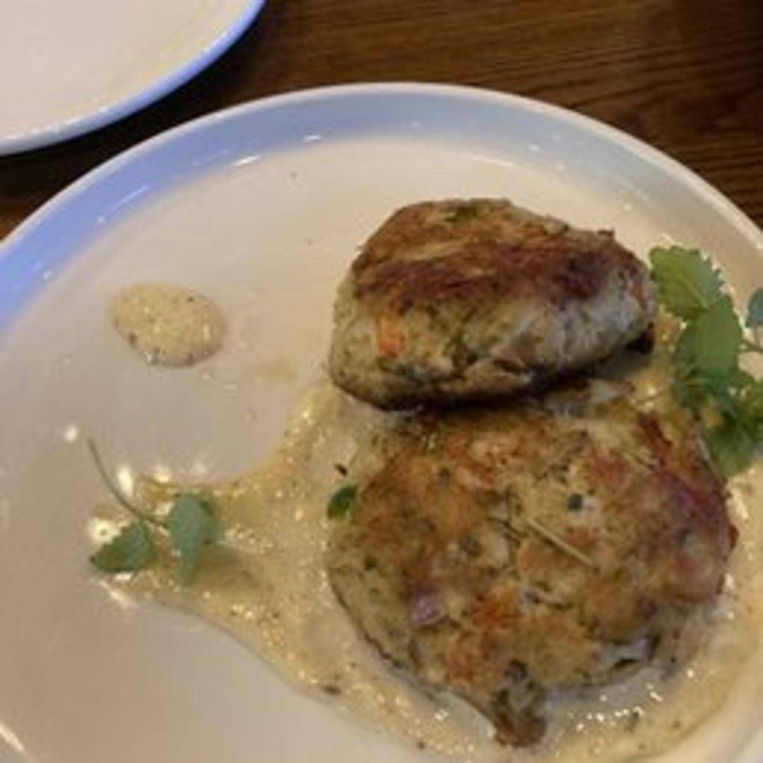Two pan-seared crab cakes made with jumbo lump crab meat and a blend of spices, served with a lemon aioli and a side of dressed greens.