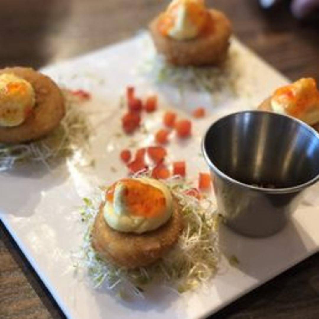 Experience a delightful twist on a Southern classic with Emmet's Social Table's Fried Deviled Eggs. This innovative appetizer features perfectly seasoned deviled egg filling, encased in a crispy, golden-fried shell, offering a warm and savory crunch before revealing the creamy, tangy interior. Each bite provides a harmonious contrast of textures and flavors, making it an irresistible start to any meal or a unique shareable plate. A must-try for those seeking adventurous yet comforting flavors.
