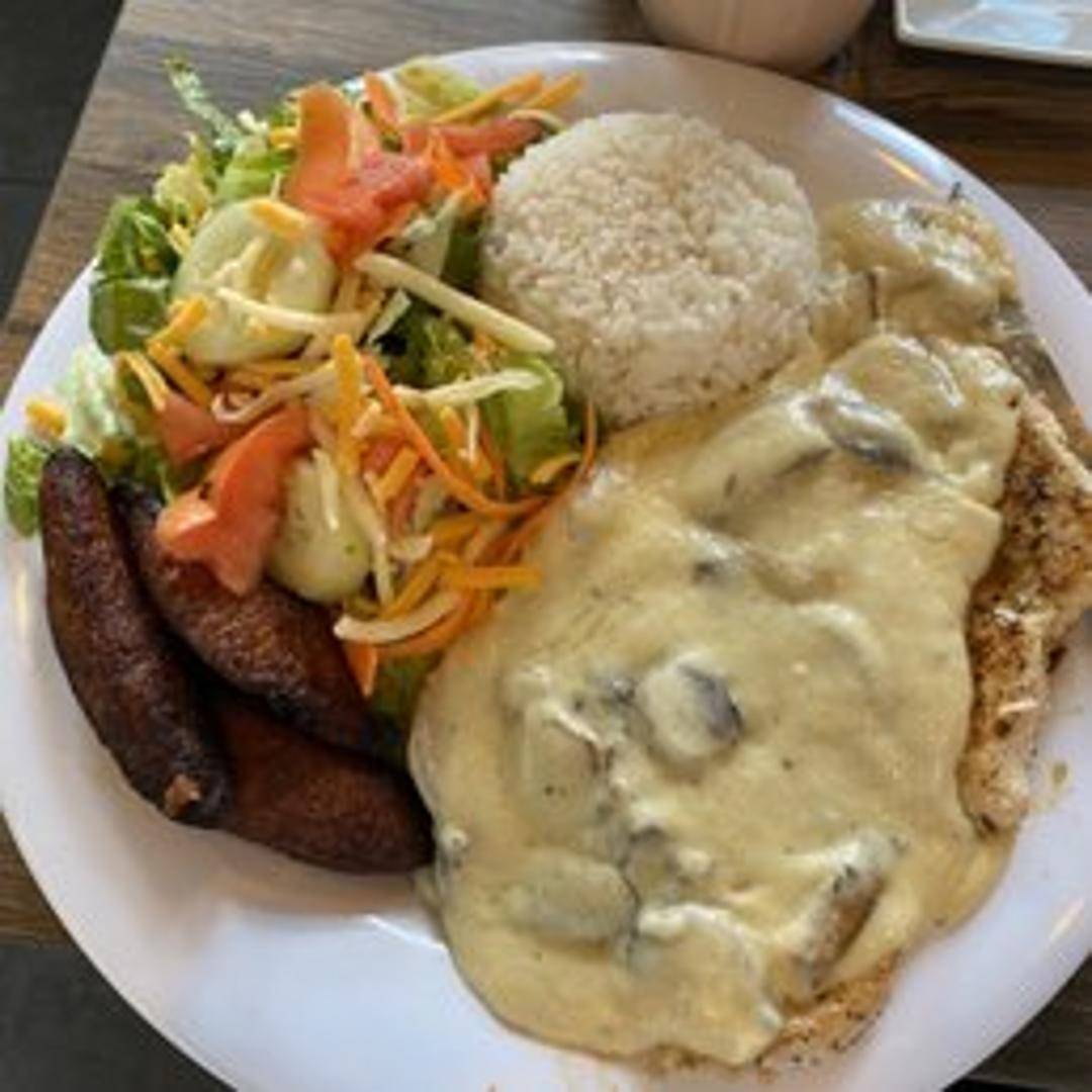 Tender chicken simmered in a creamy mushroom sauce, infused with Latin spices. A flavorful and comforting dish.