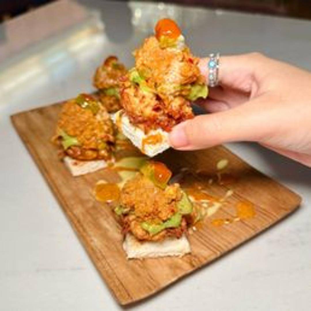 Crispy toasted bread topped with a vibrant and flavorful mixture of fresh tuna, spicy mayonnaise, avocado, and sesame seeds. Garnished with microgreens for a touch of freshness.