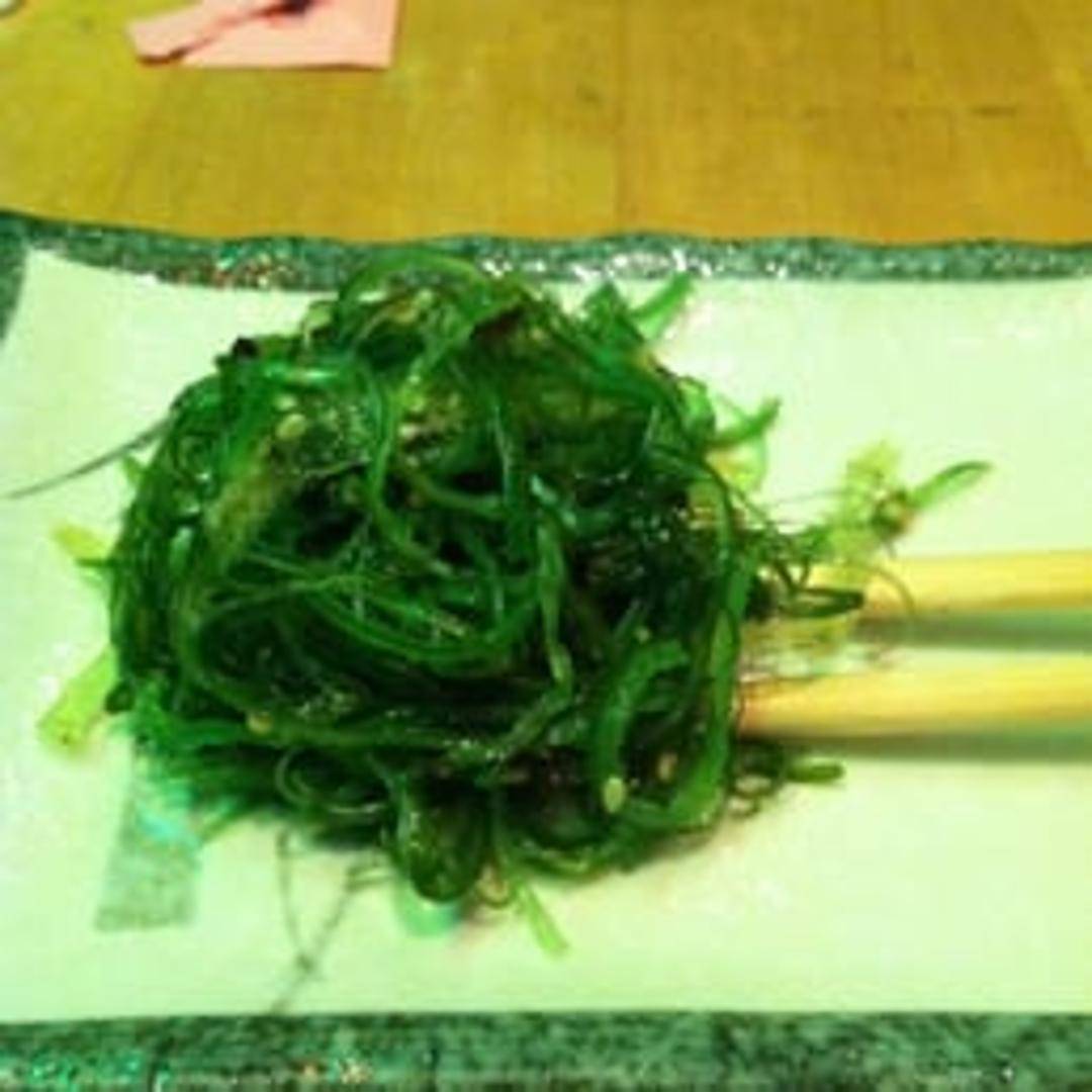 A refreshing and vibrant appetizer featuring tender marinated green seaweed, lightly dressed with a savory sesame oil and vinegar dressing, and garnished with toasted sesame seeds, offering a crisp and tangy start to any meal.