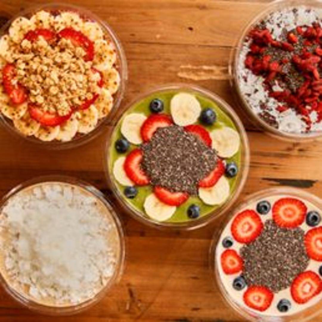 A thick and creamy smoothie served in a bowl and loaded with delicious and nutritious toppings. Customize your smoothie base with a variety of fruit combinations, such as berry blends, tropical flavors, or green smoothies. Enjoy a delightful mix of textures and flavors with toppings like granola, fresh fruit (strawberries, blueberries, kiwi, mango), nuts, seeds, and a drizzle of your favorite syrup or nut butter.