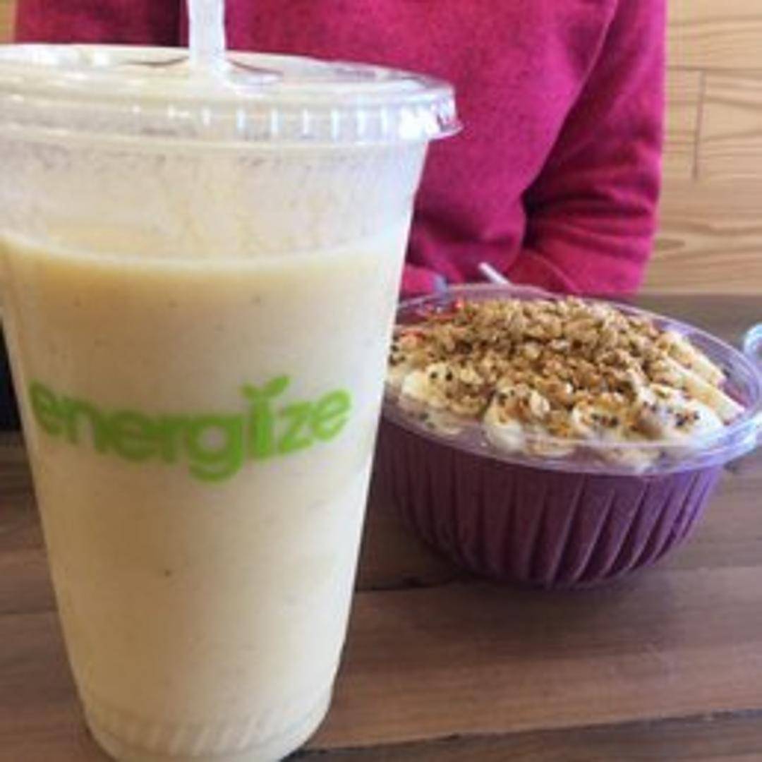 A vibrant smoothie bowl featuring a blend of mango, pineapple, banana, and coconut milk. Topped with granola, shredded coconut, and a drizzle of honey.