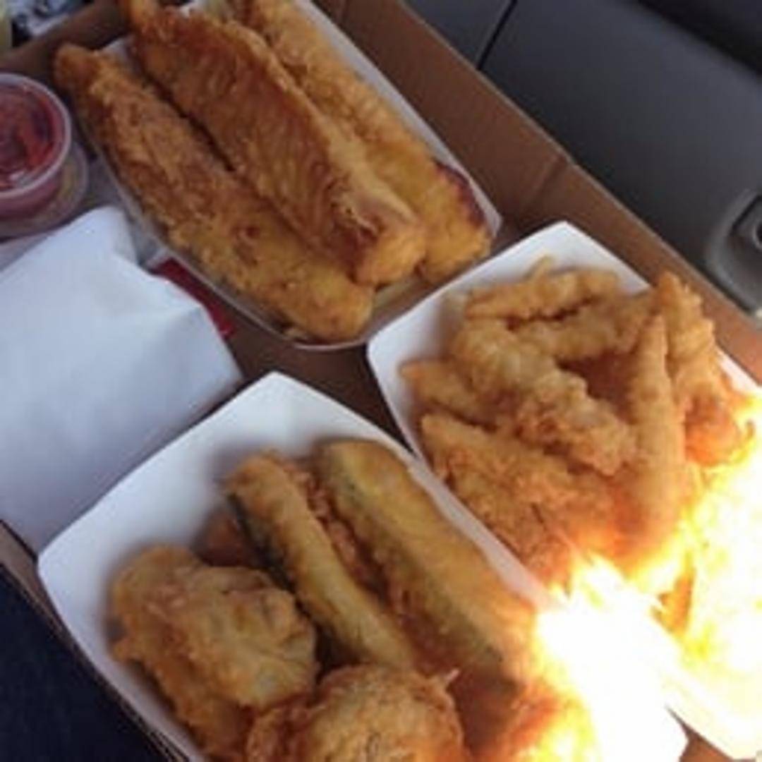 A single, flaky fish fillet, battered and fried to a golden brown.
