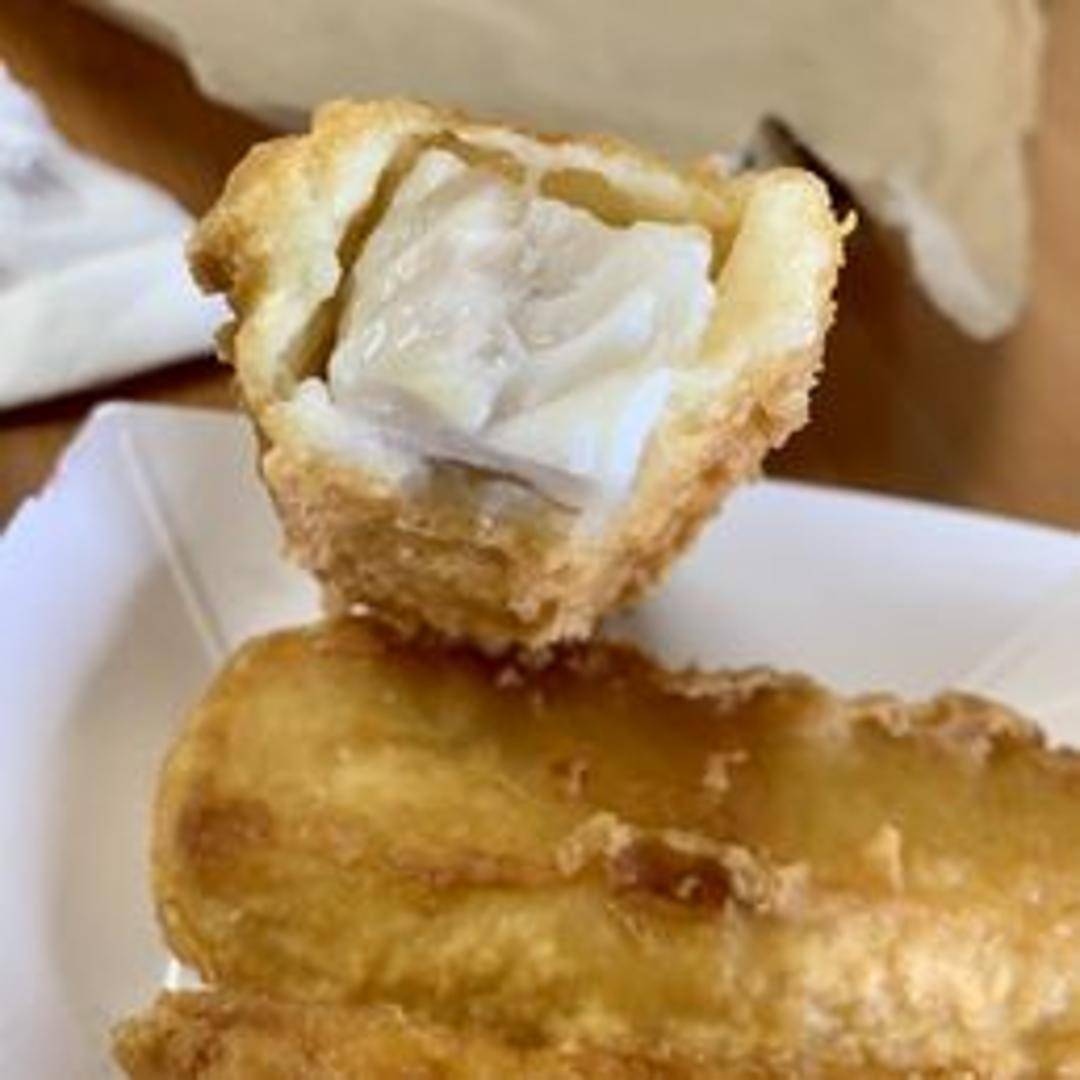 A piece of fresh fish, typically cod or haddock, coated in a light batter and deep-fried until golden brown and crispy. A classic seafood treat.
