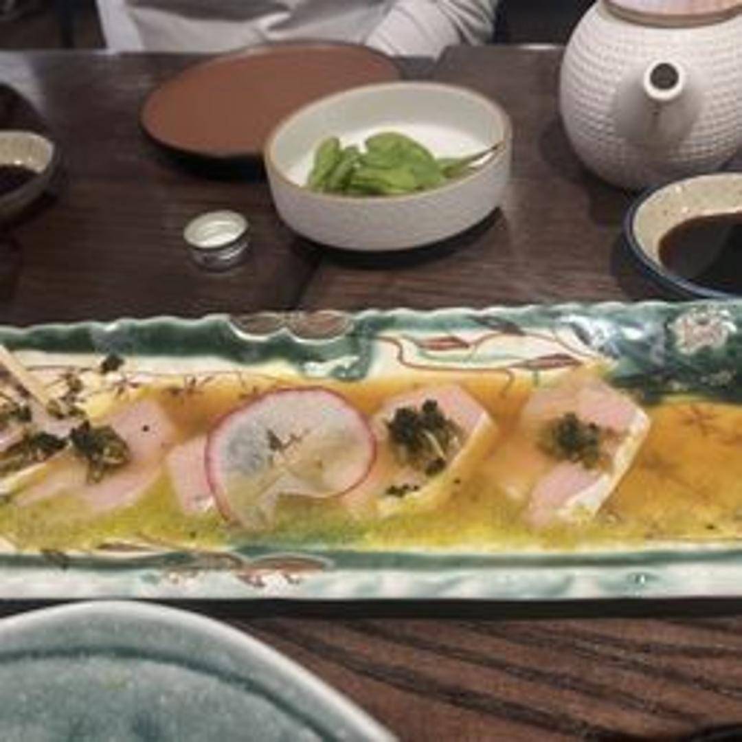 Yellowtail sushi or sashimi, typically seared or torched to enhance flavor, served with a special sauce.