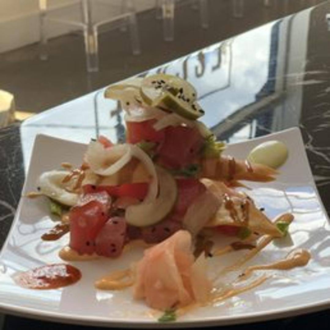 A visually stunning tower of layered flavors featuring sushi-grade ahi tuna, crispy wonton crisps, avocado, and a vibrant seaweed salad, drizzled with a tangy sesame-ginger dressing. A delightful combination of textures and tastes.