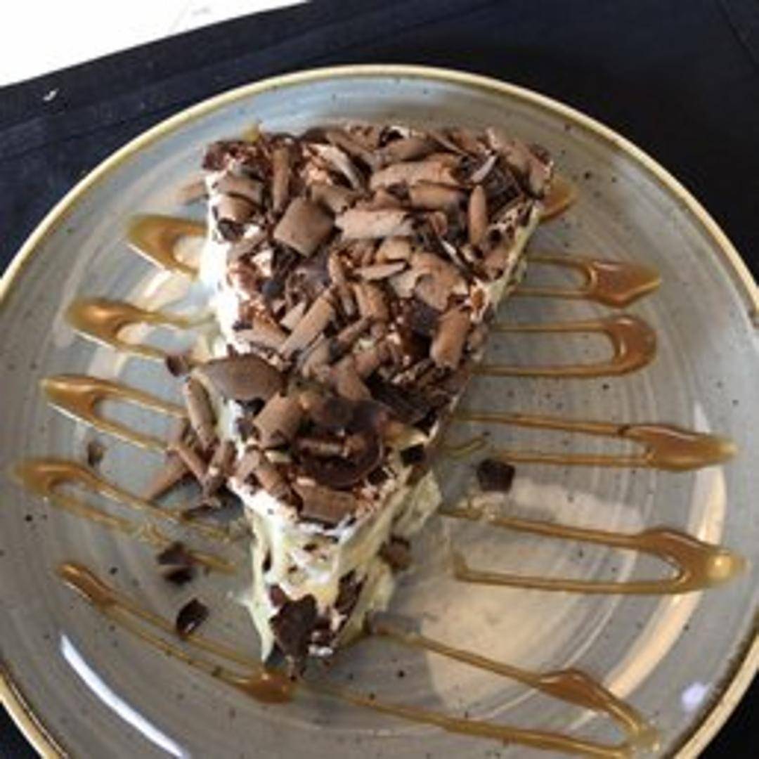 A decadent dessert featuring a layer of dark chocolate at the bottom, topped with creamy white chocolate mousse and fresh bananas. This dessert is often served chilled and may include additional elements like whipped cream, caramel sauce, or toasted nuts.