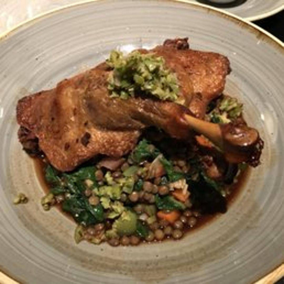 Slow-cooked duck leg, rendered crispy skin, served with complementary sides. Often features seasonal vegetables or fruits, and a flavorful pan sauce.