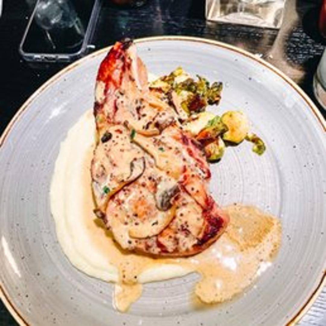 A succulent, bone-in pork chop grilled to perfection. [Insert common/likely accompaniments here, e.g., Served with mashed potatoes and apple chutney, roasted root vegetables, or a demi-glace]. Prepared with [mention specific preparation style if known or possible, e.g., a special marinade or dry rub]. A hearty and flavorful classic.