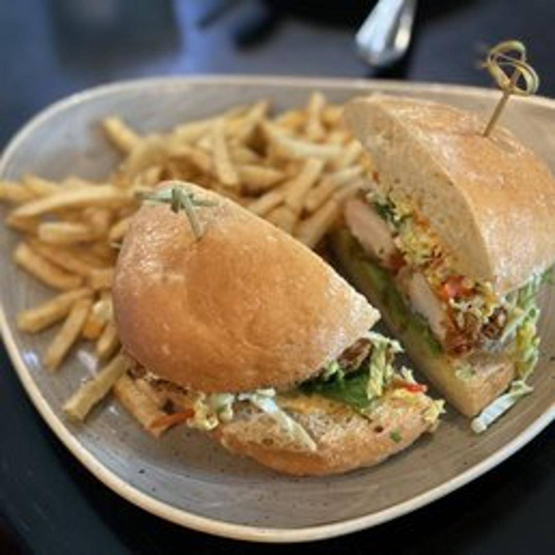 Crispy fried chicken breast served on a toasted brioche bun with lettuce, tomato, pickles, and a house-made aioli. Includes choice of side.