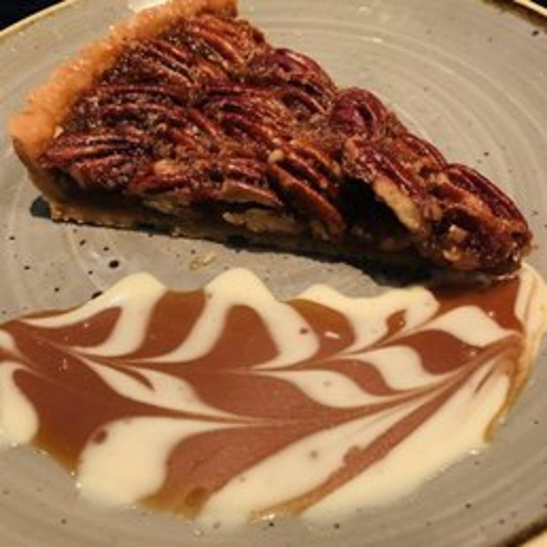 Classic pecan pie with a buttery, flaky crust. Filled with a rich, sweet custard and toasted pecans. Served warm, possibly with a scoop of vanilla ice cream or whipped cream.
