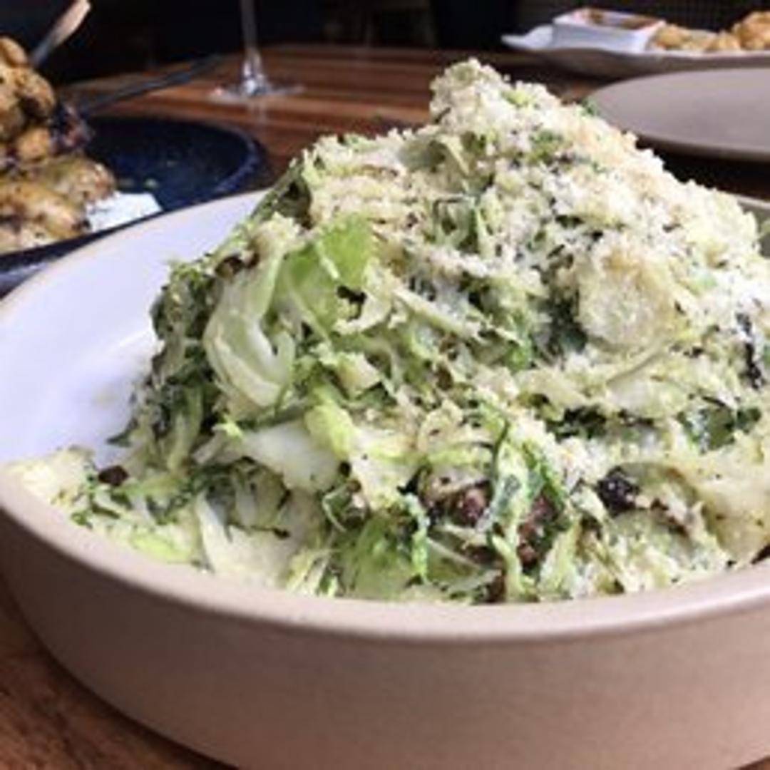 A vibrant and refreshing salad featuring crispy roasted brussel sprouts, tossed with a medley of fresh greens, toasted nuts, and dried cranberries. Finished with a light, zesty vinaigrette, offering a perfect balance of savory and sweet notes for a delightful start or a light meal.