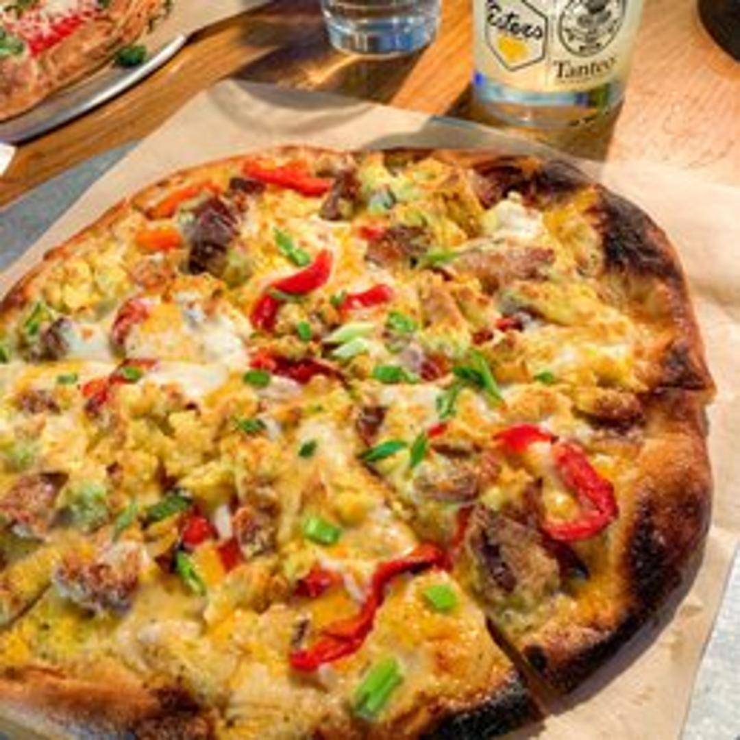 Pizza topped with breakfast favorites like scrambled eggs, bacon or sausage, cheese, and potentially other breakfast-themed toppings.