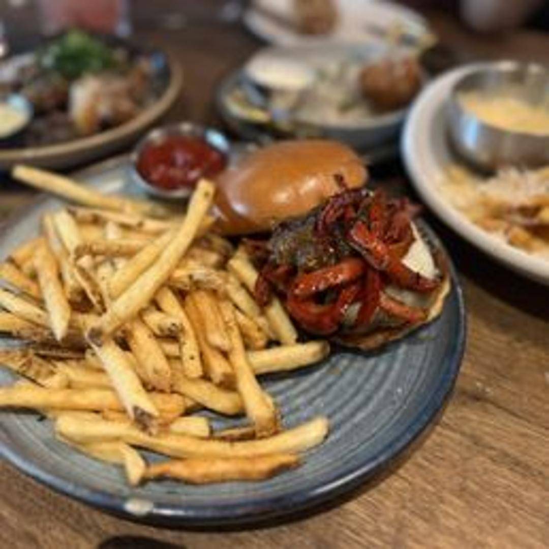 Grilled bison patty served on a brioche bun with caramelized onions, bacon, cheddar cheese, and a horseradish aioli.