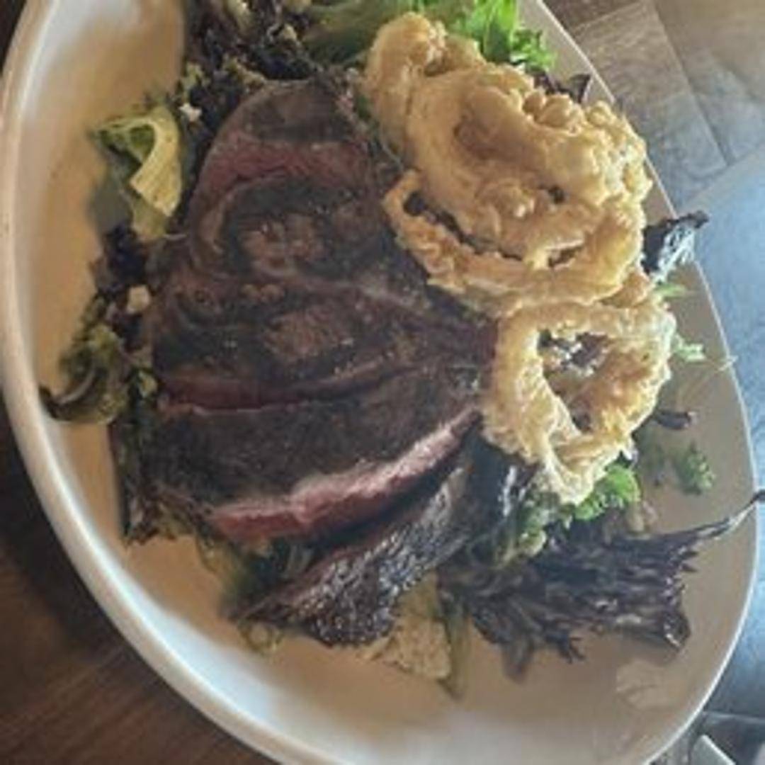 Grilled steak atop a bed of mixed greens with seasonal vegetables, crumbled blue cheese, and a balsamic vinaigrette.