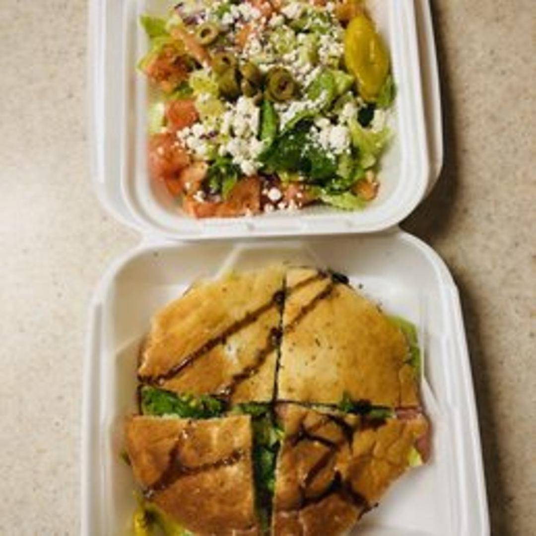 Fresh salad with mixed greens, tomatoes, cucumbers, olives, red onion, feta cheese, and a Mediterranean vinaigrette.